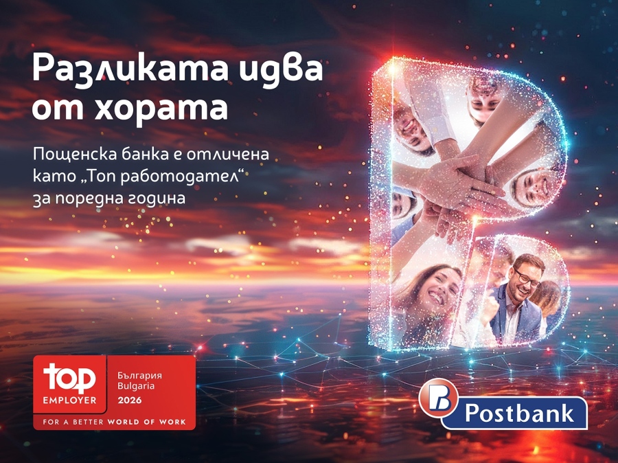 „Престижният сертификат от международния и независим Top Employers Institute е признание за нашата културна идентичност, която устойчиво развиваме, за да запазим мястото си сред най-добрите и предпочитани компании за работа в света. Стратегическият ни фокус върху хората, културата и развитието дава реални резултати. Вярваме, че истинската трансформация започва отвътре – с нашите екипи, тяхната ангажираност, увереност и желание да растат. Благодарим на всички колеги, които всеки ден допринасят за това Пощенска банка да бъде място, където се създава бъдеще с грижа, смисъл и визия“, коментират от Пощенска банка.