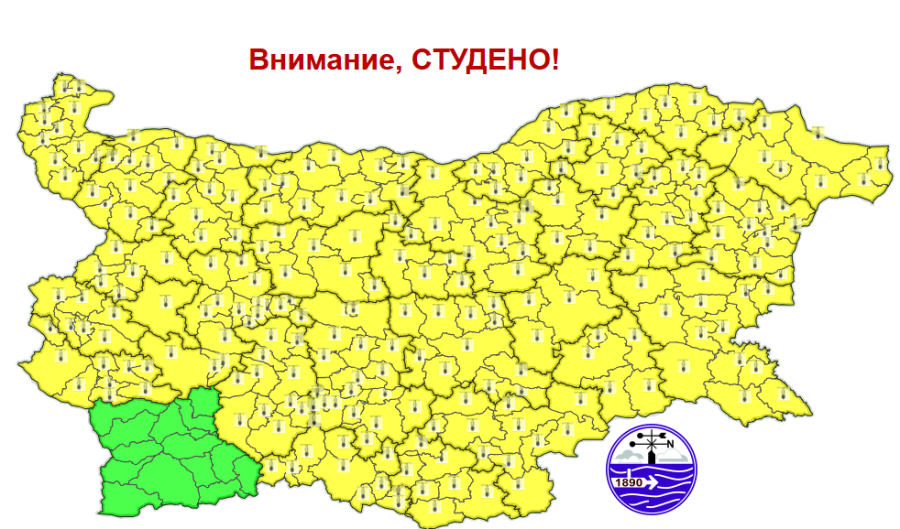 В по-голямата част от страната максималните температури ще бъдат между минус 5° и 0°, в Югозападна България – до 5° - 7°, за София максималната температура ще е около 0°.
