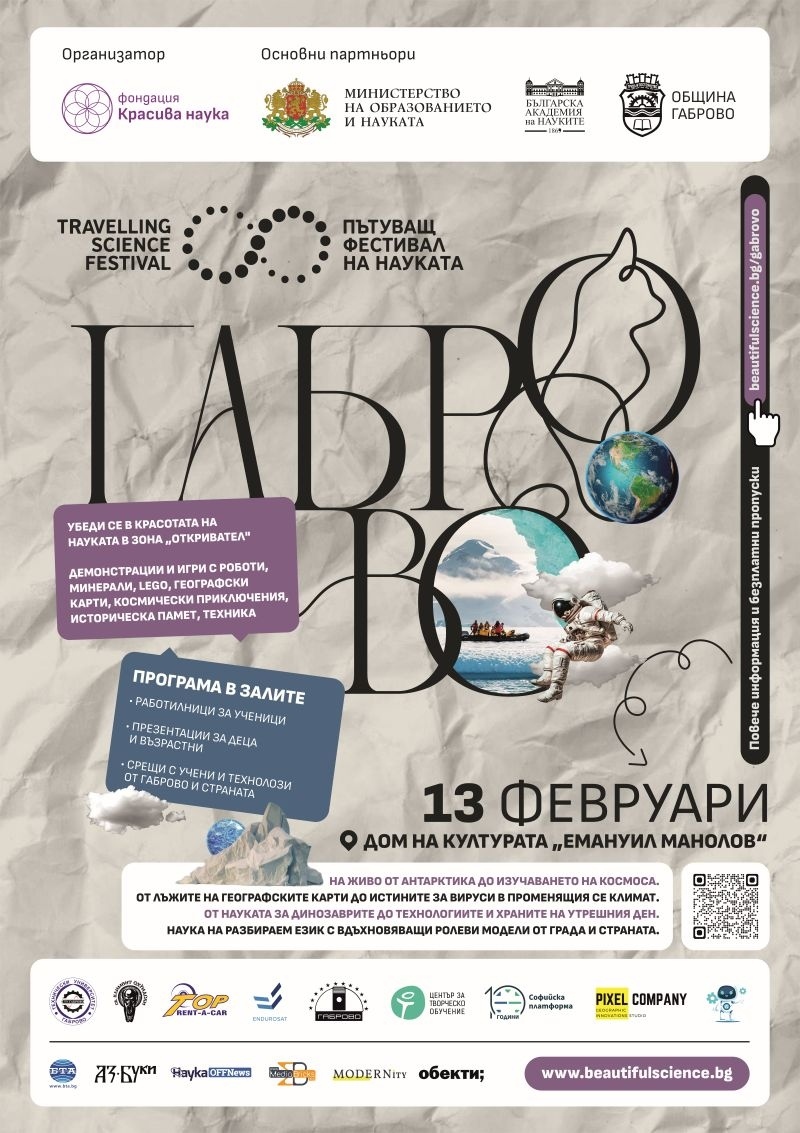 От минерали с планетарен произход на Земята и ледниците на Антарктика до космически технологии. От лъжите в географските карти до истините за вируси в променящия се климат. От науката за динозаврите до технологиите и храните на утрешния ден. В петък, 13 февруари 2026 г., в Дома на културата „Емануил Манолов“ Фондация „Красива наука“ и Община Габрово организират еднодневен празник на науката и технологиите с участието на изследователи и инженери от региона и страната.
