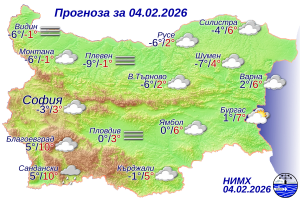 След обяд от югозапад ще започнат валежи от дъжд, които ще продължат и през нощта срещу четвъртък. Вятърът ще е слаб, в много райони и ще стихва, а в Североизточна България и в районите близо до северните планински склонове ще духа умерен вятър от юг-югоизток. Минималните температури ще бъдат предимно между минус 8° и минус 3°, по-високи в Южна България, а максималните – между 4° и 9°, по-ниски в районите с трайна мъгла. В София минималната температура ще бъде около минус 2°, а максималната – около 3°.