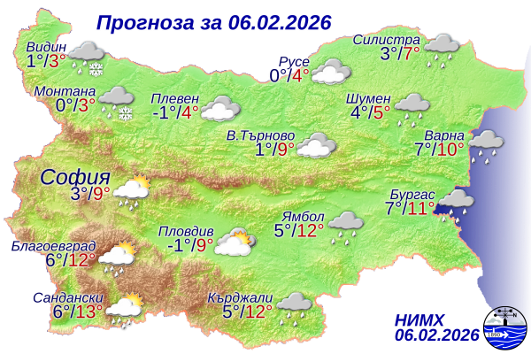 В северозападните райони остават условията за поледици. Почти тихо време. Максималните температури ще са в широк интервал, от 3° - 5° в Северозападна България където ще остане облачно до 13° - 15° в крайните югозападни и югоизточни райони от страната.