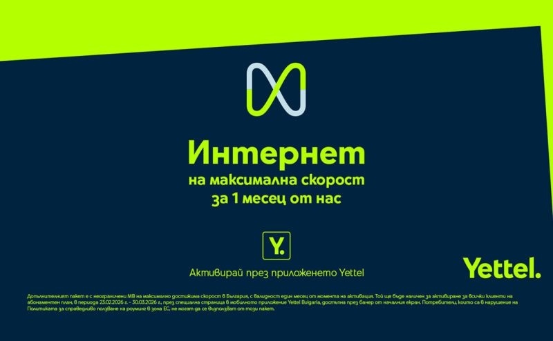 Пакетът включва и 3900 MB мобилен интернет в роуминг зона ЕС*, а активацията е възможна до 31 март 2026 г. директно през мобилното приложение на оператора – чрез банер на началния екран в секция „За теб“.