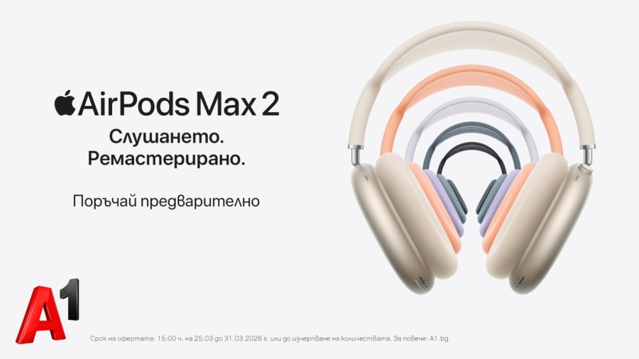Новият модел осигурява до 20 часа време за слушане с включен ANC, което го прави надежден избор както за дълги пътувания, така и за интензивно ежедневие. Комбинацията от висока производителност, интелигентни функции и емблематичен дизайн превръща AirPods Max 2 в предпочитан избор за потребители, които търсят безкомпромисно аудио качество и комфорт. Слушалките се предлагат в пет цвята – Midnight, Starlight, Blue, Orange, Purple, и могат да бъдат поръчани предварително от А1 за 579,98 евро/1134,34 лева в брой или 28,50 евро/55,74 лева на лизинг за 24 месеца с план Unlimited онлайн на сайта на телекома до 31 март.