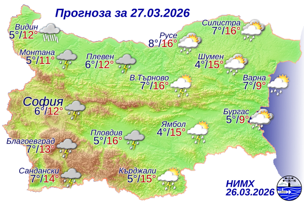През нощта облачността над страната ще се увеличи и утре ще бъде облачно. Сутринта в Западна България ще започнат валежи от дъжд, които до вечерта ще обхванат почти цялата страна, съобщиха от Националния институт по метеорология и хидрология. По високите части на планините ще вали сняг. На много места валежите ще бъдат придружени с гръмотевици и главно в Западна България и планинските райони значителни по количество. Ще духа умерен, а в Дунавската равнина и Горнотракийската низина временно силен източен вятър. Минималните температури ще бъдат между 4° и 9°, за София – около 6°, максималните в повечето места - между 11° и 16°, за София – около 12°.