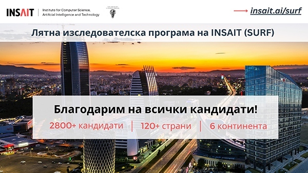 Институтът за компютърни науки, изкуствен интелект и технологии (INSAIT), част от Софийския университет “Св. Климент Охридски”, успешно приключи приема на кандидатури за тазгодишното издание на своята лятна изследователска програма SURF, която отново привлече изключителен международен интерес.